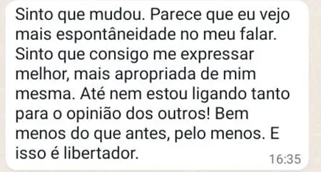 Percebi que cada hesitação, cada palavra que eu engolia, cada vez que minha garganta se apertava, era um chamado para olhar para dentro e libertar quem eu realmente sou.